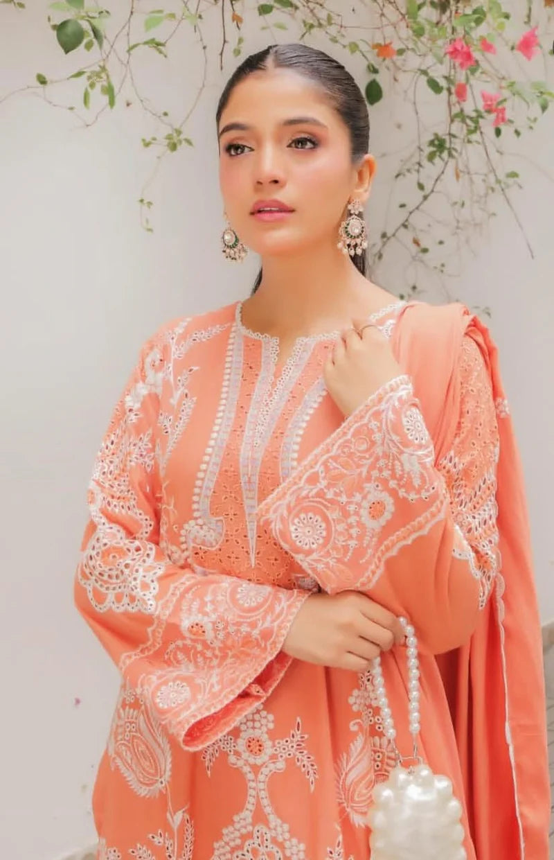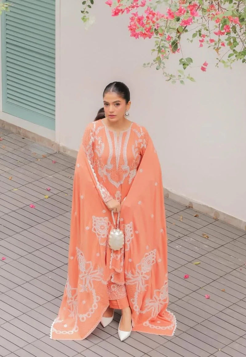 Embrace winter sophistication with Winter e Glow — a refined ready-to-wear ensemble crafted for modern Pakistani women. Designed in premium slub khaddar and adorned with fine embroidery, this soft peach outfit delivers warmth, elegance, and effortless style. Its graceful silhouette and luxurious finish make it a timeless winter essential that keeps you cozy without compromising on class.