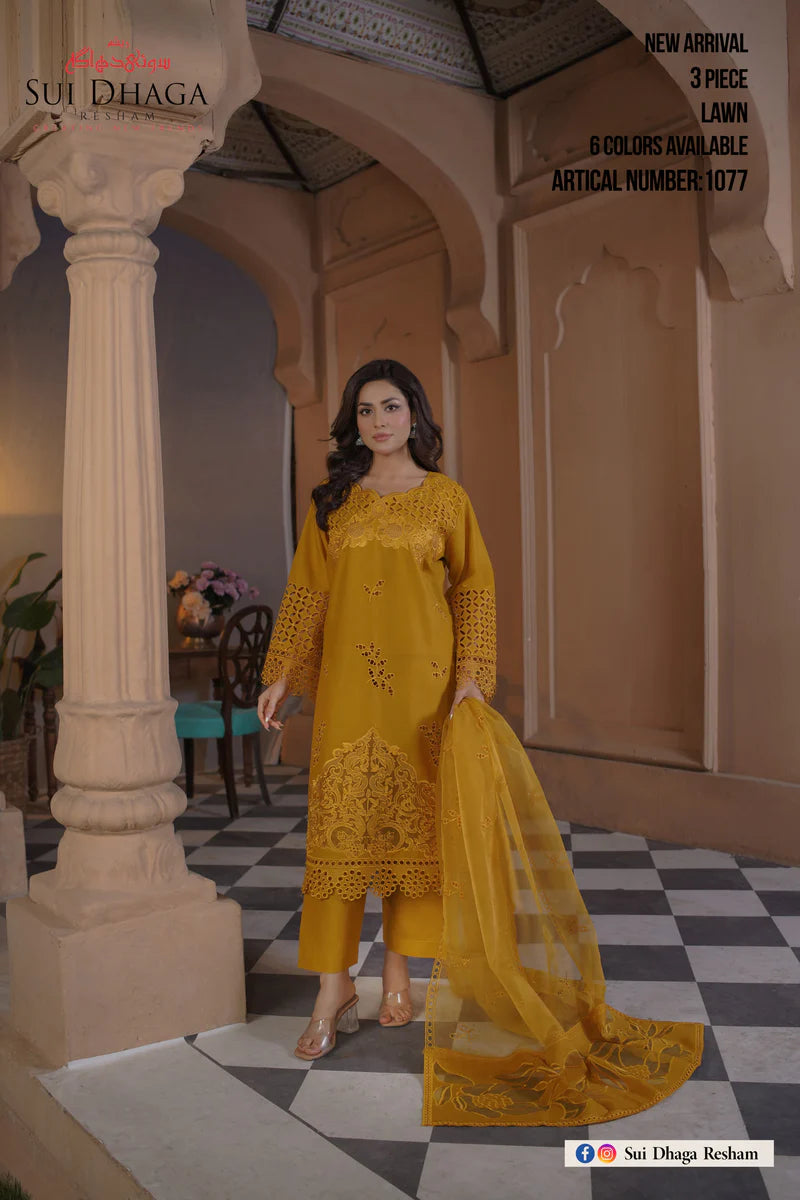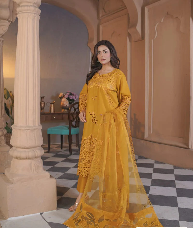 SEO Keywords: golden festive lawn suit Pakistan, 3 piece stitched suit for women,